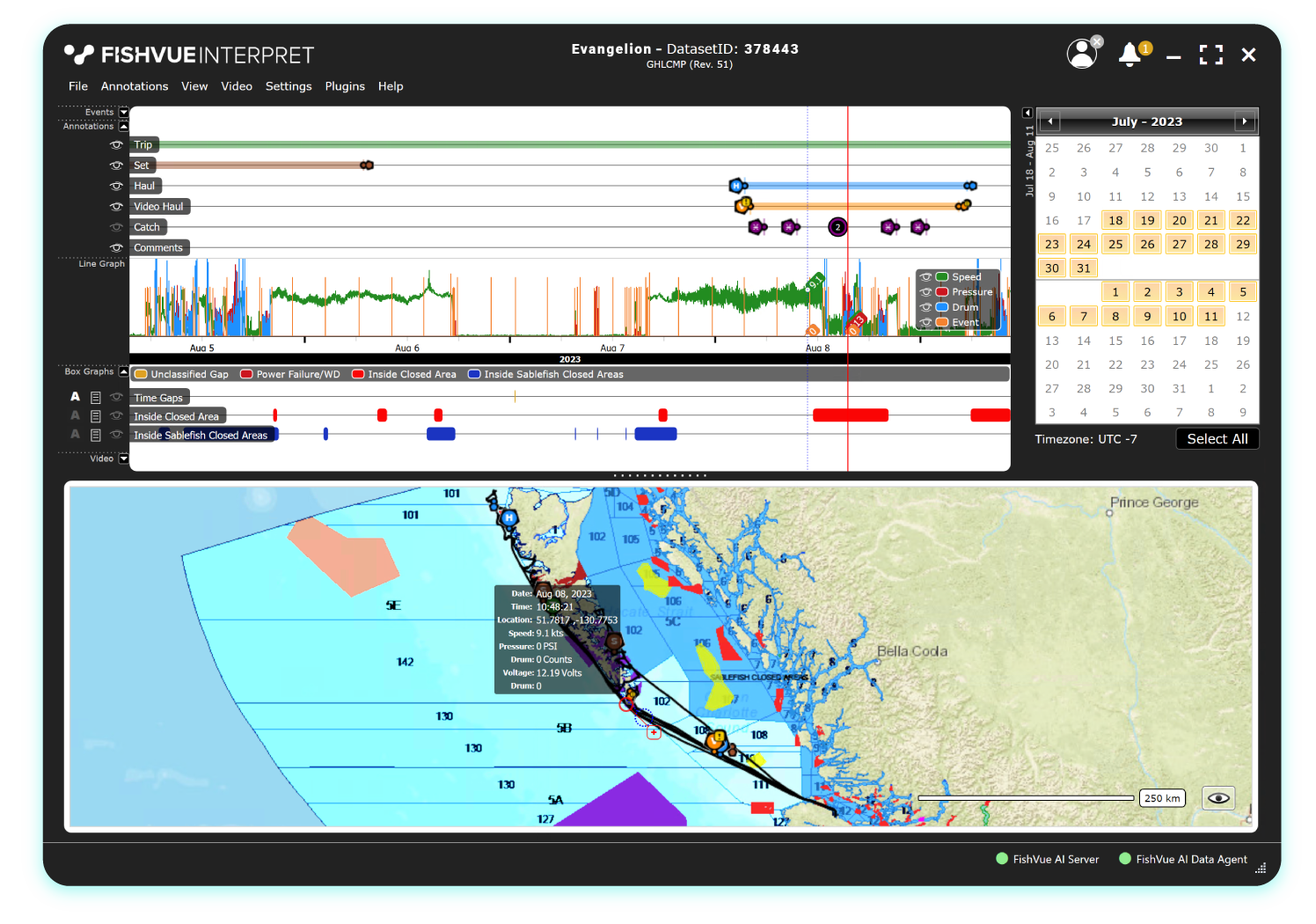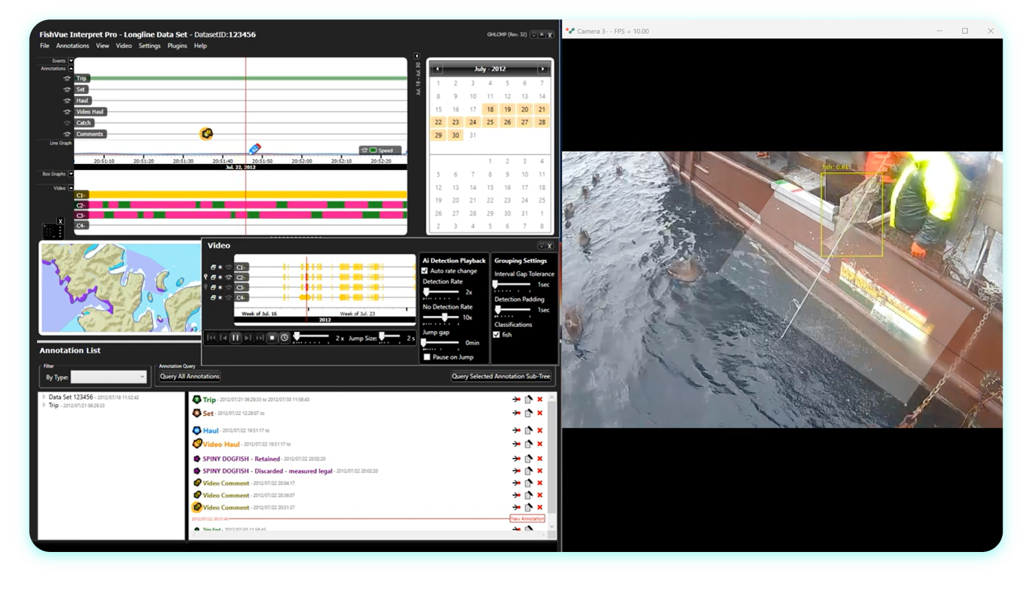 FishVue Interpret is our comprehensive analysis tool for reviewing EM data. FishVue Interpret operates on a standard PC and allows for the visualization of EM datasets to easily examine specific events in greater detail. FishVue Interpret lets reviewers record observations while reviewing the data and is easily configured for the specific needs of any project. FishVue Interpret was developed to increase the efficiency of the data review process. A typical fishing trip may generate hundreds of hours of data, but FishVue Interpret allows reviewers to easily navigate large data sets, identify events of interest, and summarize their observations at a fraction of real time.
