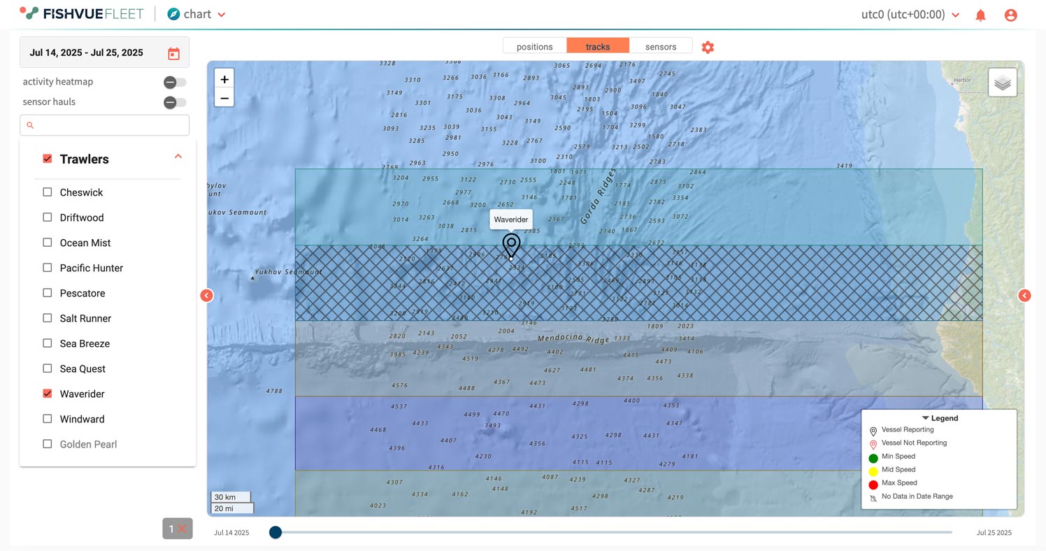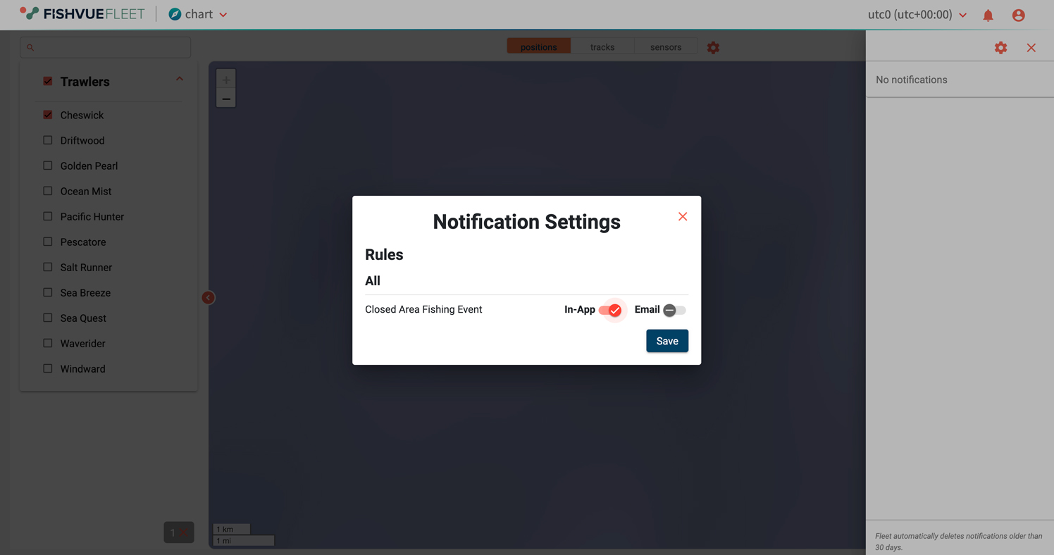 Fleet supports proactive compliance by pairing vessel trails with closed-area context. Teams can confirm whether a vessel entered or passed through a closed zone and use notifications to respond quickly when an incursion is detected.