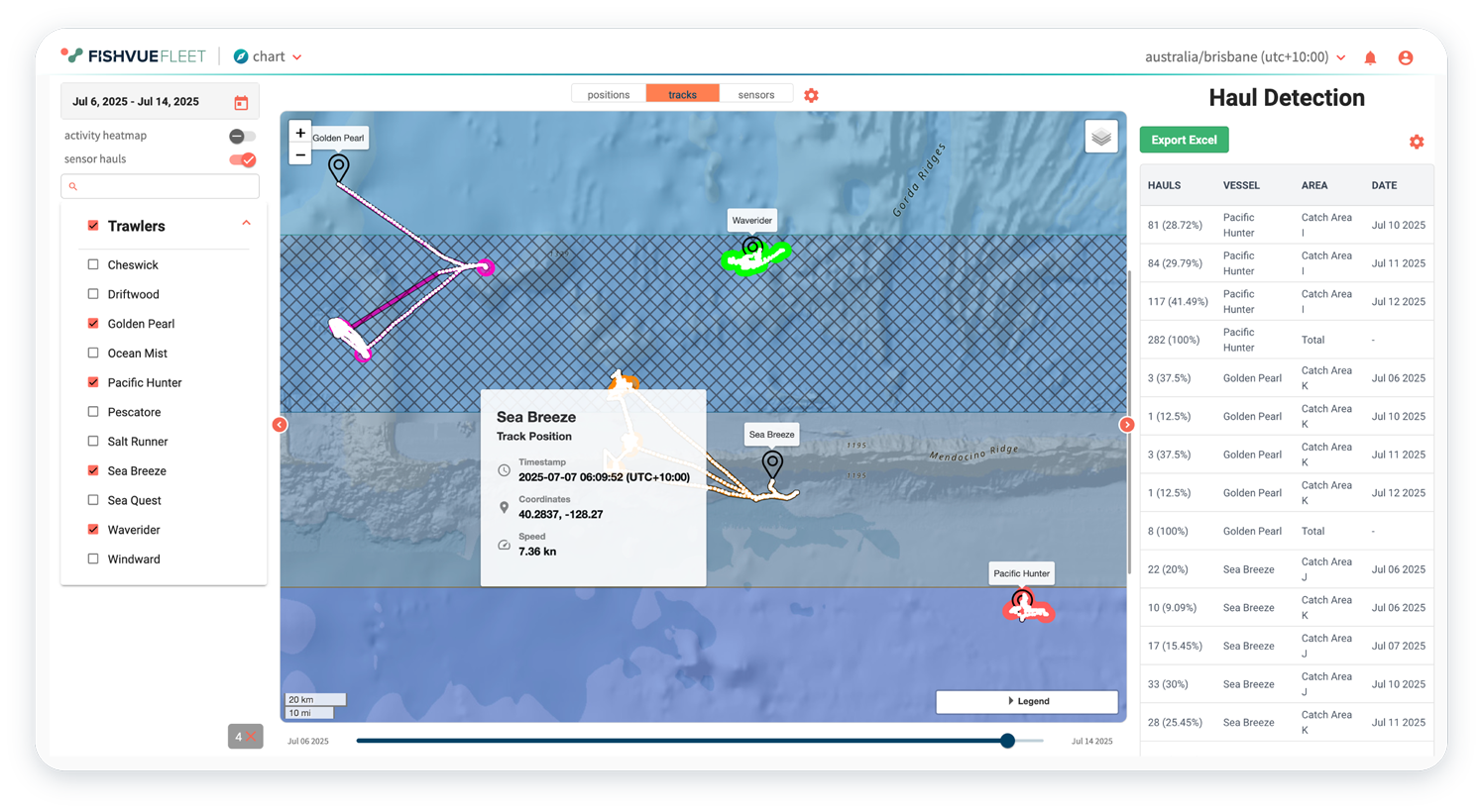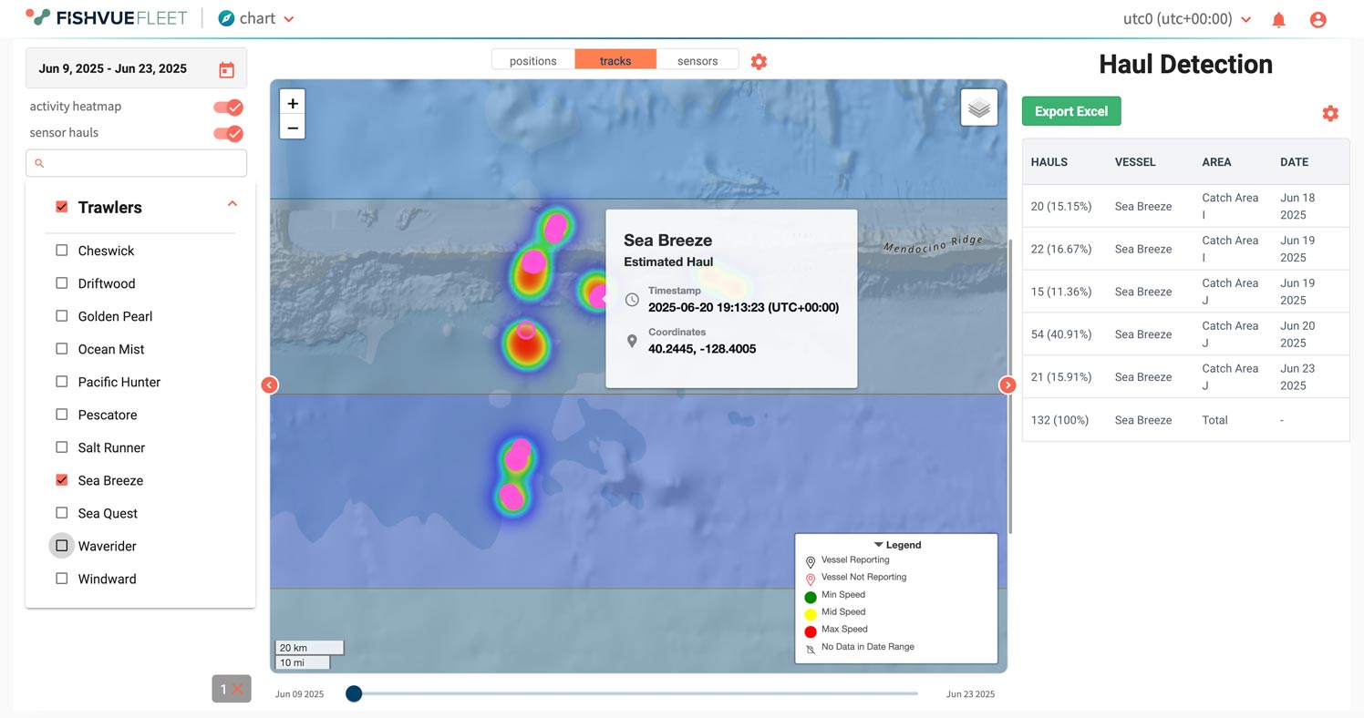 Fleet provides activity context derived from onboard EM inputs, enabling hauls and locations to be tracked and analyzed across time. Viewing fishing activity by sensor type helps teams interpret gear deployment and retrieval patterns and focus attention on periods that matter.